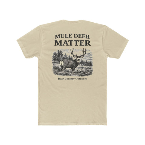 A soft, lightweight crew tee that carries a quiet country attitude. The front bears a small, understated emblem over the chest while the back shows a detailed mule deer scene and the phrase “MULE DEER MATTER” in a weathered, vintage style. Wear it around the ranch, at the trailhead, or layered under a flannel for evenings by the fire — it sits comfortably against the skin and drifts easily from active days.